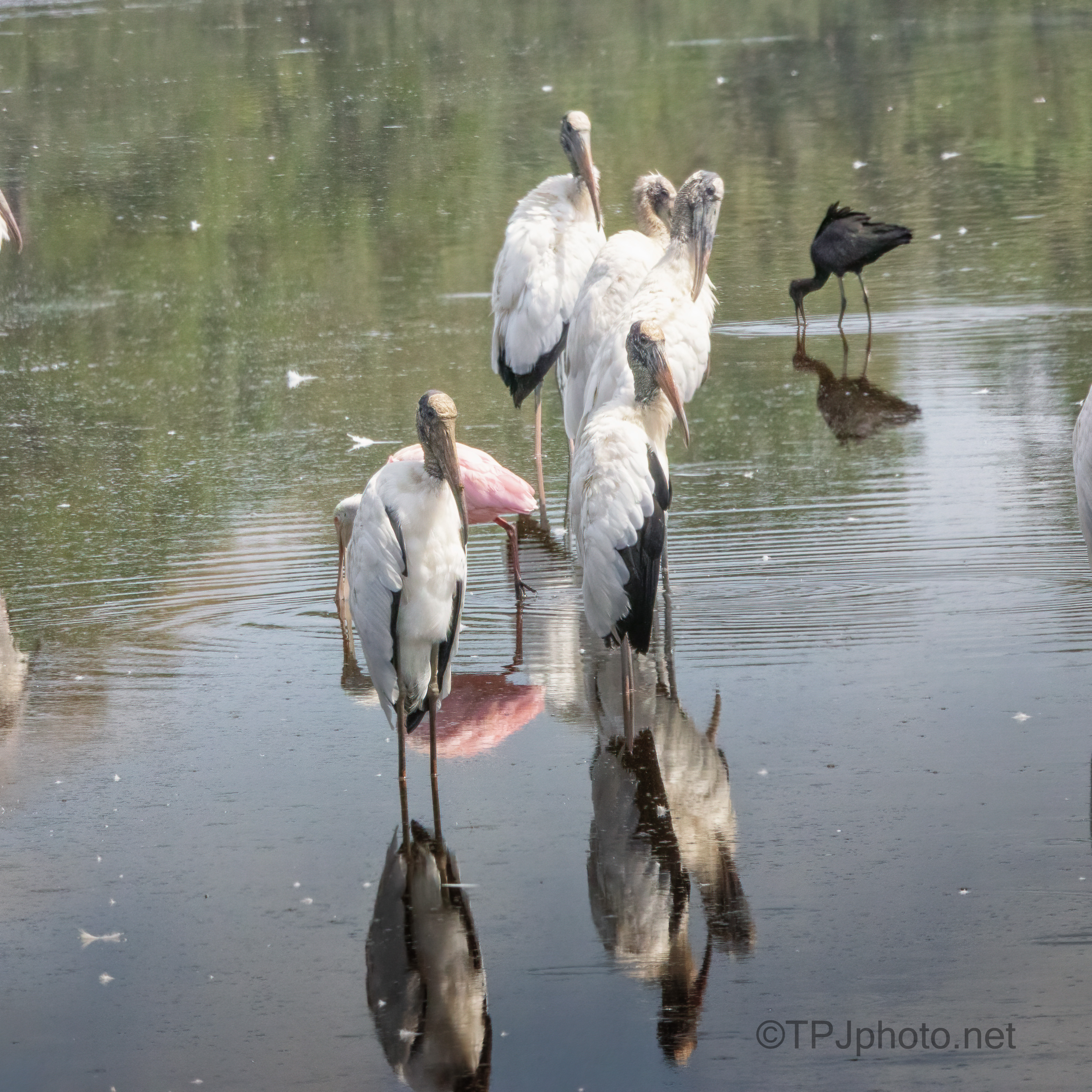Besides the big Wood Storks, a Glossy Ibis is feeding in the background, and there is a ‘pink butt’ of a Spoonbill if you look closely.